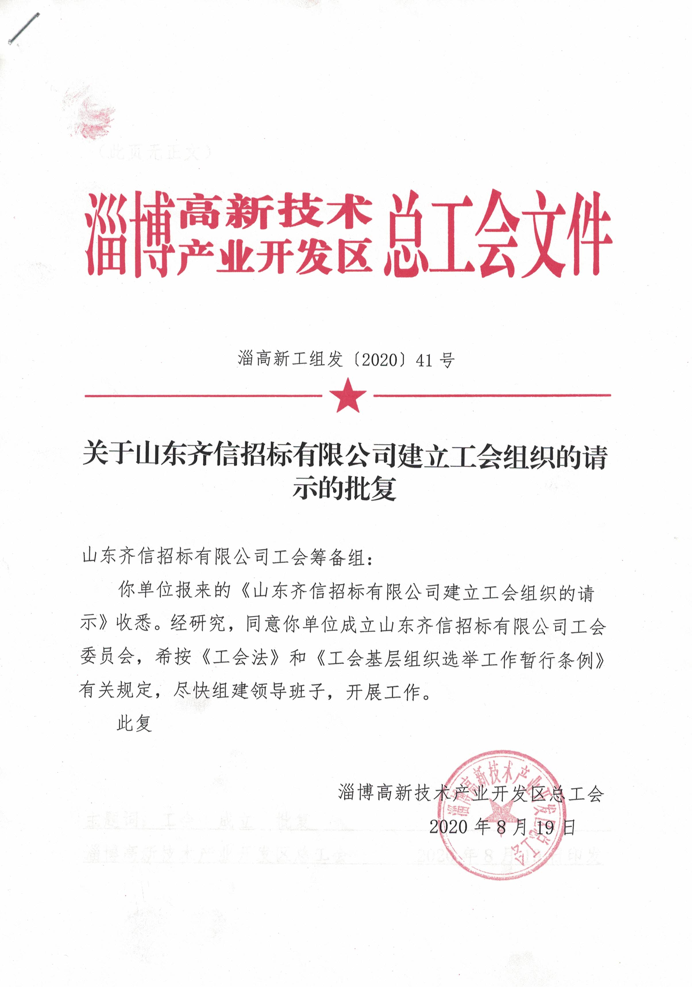 2020年9月1日,山東齊信招標(biāo)有限公司工會成立會議召開,公司黨支部書記、董事長郭培勛、黨支部委員許春萌、陳秀娟、第一屆工會主席王偉等參加會議,會議由黨支部委員陳秀娟主持。