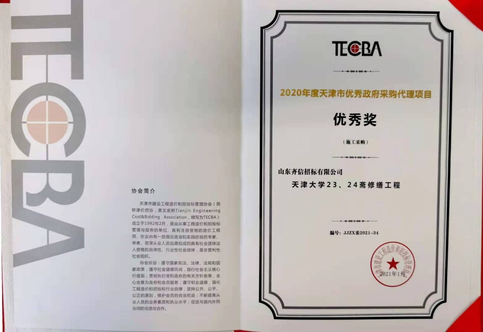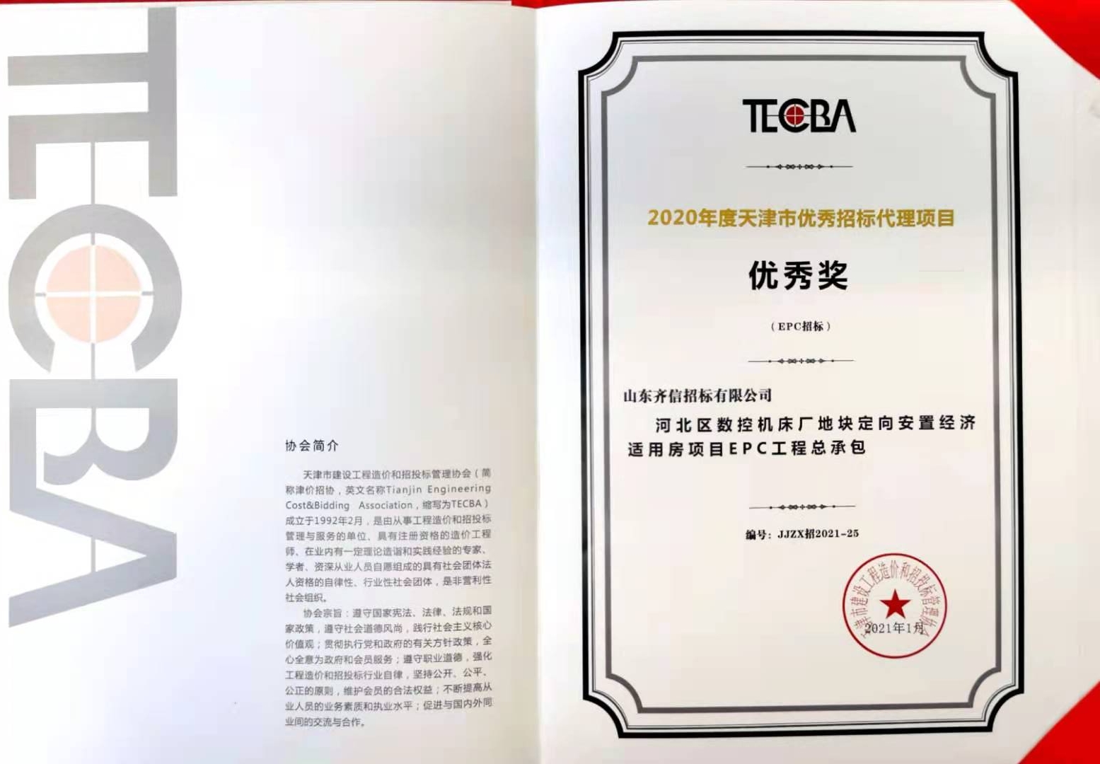 2021年1月,天津市建設(shè)工程造價(jià)和招投標(biāo)管理協(xié)會公布2020年度天津市“優(yōu)秀招標(biāo)代理項(xiàng)目”、“優(yōu)秀政府采購代理項(xiàng)目”,齊信天津分公司的“河北區(qū)數(shù)控機(jī)床廠地塊定向安置經(jīng)濟(jì)適用房項(xiàng)目EPC工程總承包”入選優(yōu)秀招標(biāo)代理項(xiàng)目,“天津大學(xué)23、24齋修繕工程”入選優(yōu)秀政府采購代理項(xiàng)目。