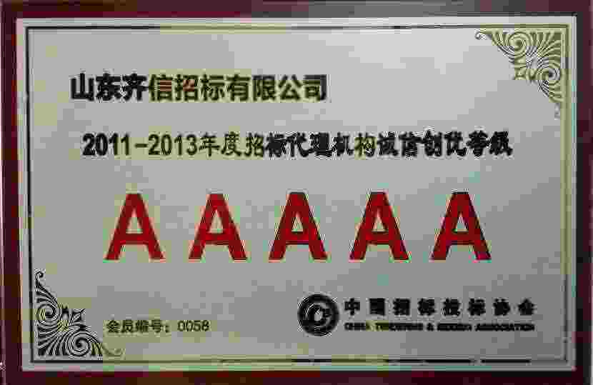 在中國(guó)招標(biāo)投標(biāo)協(xié)會(huì)組織開展的“2011-2014年度招標(biāo)代理機(jī)構(gòu)誠(chéng)信創(chuàng)優(yōu)”活動(dòng)中,通過(guò)協(xié)會(huì)嚴(yán)格審核把關(guān),山東齊信招標(biāo)有限公司在全國(guó)近千家招標(biāo)代理機(jī)構(gòu)中脫穎而出,獲得“5A”等級(jí),這是公司自2010年起聯(lián)系第三次參加協(xié)會(huì)誠(chéng)信創(chuàng)優(yōu)評(píng)選,均獲得最高等級(jí),凸顯了公司在國(guó)內(nèi)同行中的較高水平和行業(yè)地位。