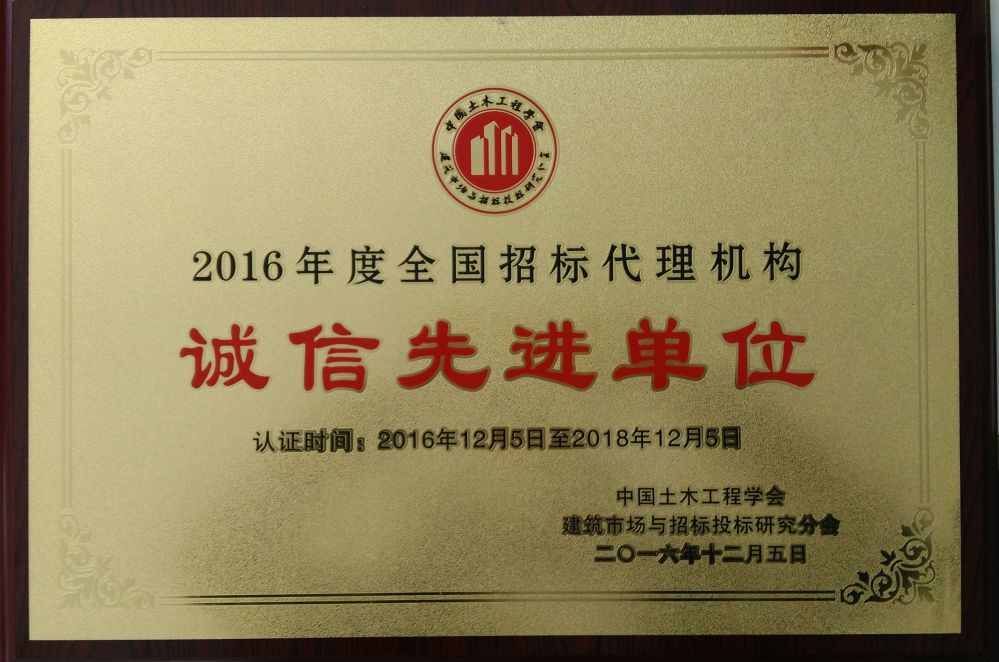 中國土木工程學(xué)會建筑市場與招投標(biāo)研究分會在全國行業(yè)范圍內(nèi)開展了“2015-2016年度全國建設(shè)工程招標(biāo)代理機構(gòu)誠信先進單位”評選表彰活動。經(jīng)各省、自治區(qū)、直轄市相關(guān)部門組織初審,嚴(yán)格把關(guān),評選推薦并報中國土木工程學(xué)會建筑市場與招標(biāo)投標(biāo)研究分會全國建設(shè)工程招標(biāo)代理機構(gòu)專家咨詢委員會評審,最終評選出全國“誠信先進單位”,山東齊信招標(biāo)有限公司獲得了本次“誠信先進單位”的榮譽稱號。