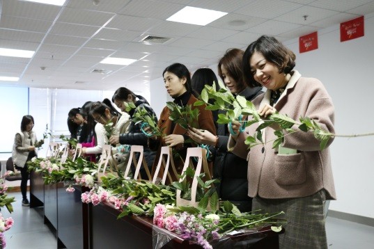 在短暫的介紹之后就是本次活動(dòng)的高潮環(huán)節(jié),開始實(shí)踐插花。浪漫粉色的玫瑰,零星點(diǎn)點(diǎn)的滿天星,還有各色花卉放滿了桌子。大家插花時(shí),講究色彩搭配,錯(cuò)落有致,也有藝術(shù)感滿分的同事開始了與眾不同的藝術(shù)插花,同樣美麗別致。熱鬧的一個(gè)上午很快就過去了,活動(dòng)圓滿地落下了帷幕。每位女同事都手捧鮮花,歡度佳節(jié)。